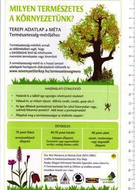 Vácrátóti ökológuskutatóink (MTA ÖK, Ökológiai és Botanikai Intézet) egy mindenki által könnyen használható természetességmérőt állítottak össze öt élőhelytípusra, amelyeknek könnyedén megállapíthatjuk a természetességét vagy leromlottságát a kiadványban található pontozásos módszerrel. Iskolai csoportoknak, természetismereti-környezetvédelmi szakköröknek kifejezetten ajánljuk.